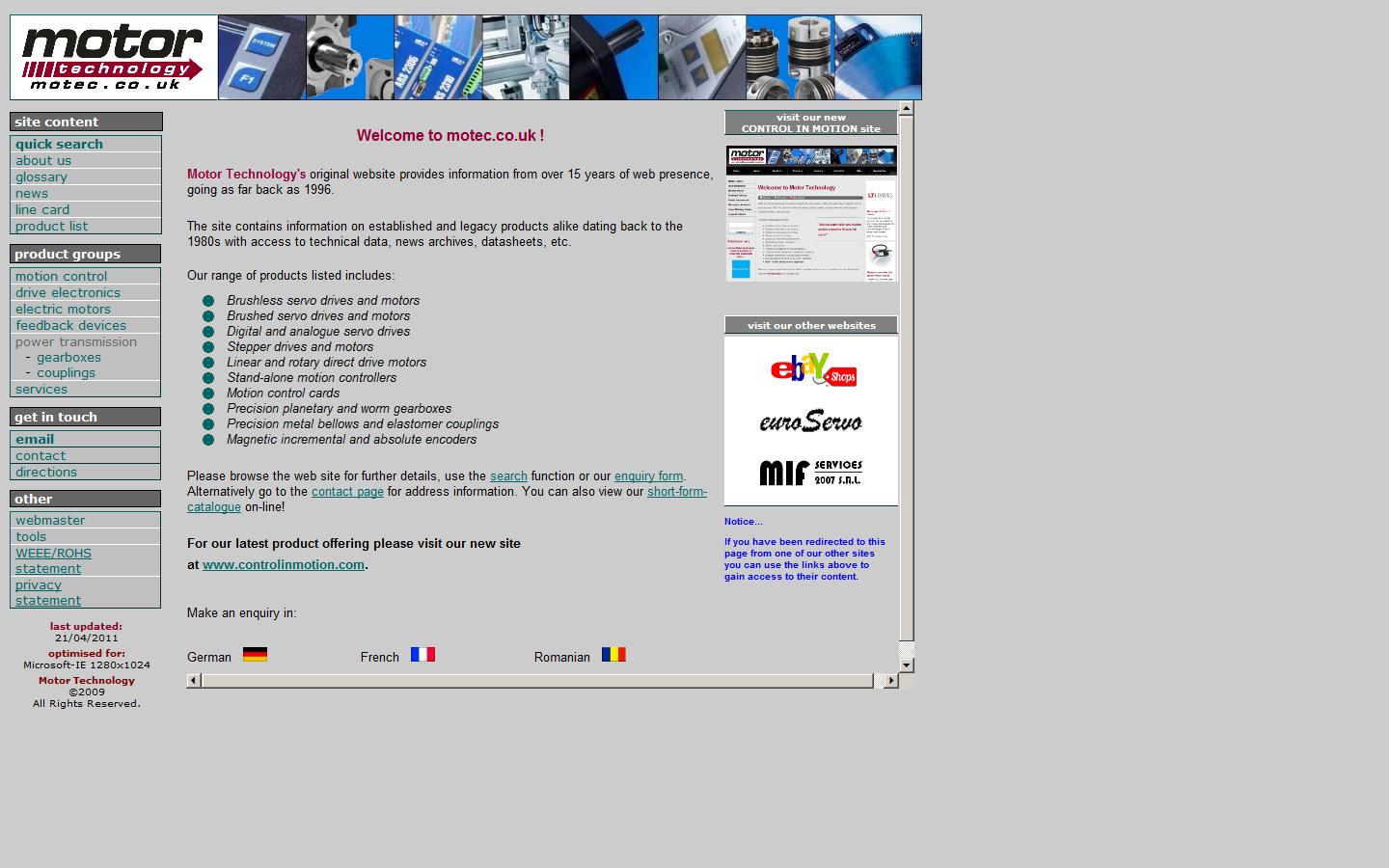 Since 1985 Motor Technology have been providing solutions to automation problems across industry. Our range of products includes servo drives and motors, stepper drives and motors, motion controllers, precision gearboxes and couplings, as well as feedback devices. We can assist with specifying a single coupling, sizing a drive axis or designing a complete turnkey control system. Whatever your requirement Motor Technology aim to give you the best solution for your application, drawing from our wide product range and extensive experience in solving automation and motion control problems.