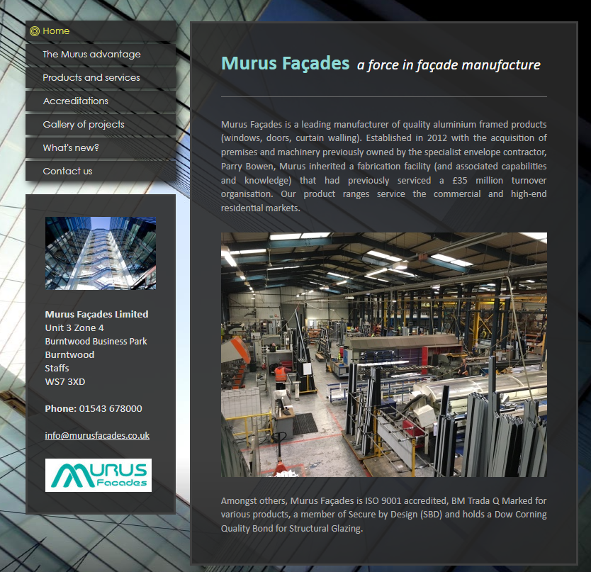 Murus Façades is a leading manufacturer of quality aluminium framed products (windows, doors, curtain walling). Established in 2012 with the acquisition of premises and machinery previously owned by the specialist envelope contractor, Parry Bowen, Murus inherited a fabrication facility (and associated capabilities and knowledge) that had previously serviced a £35 million turnover organisation. Our product ranges service the commercial and high-end residential markets.