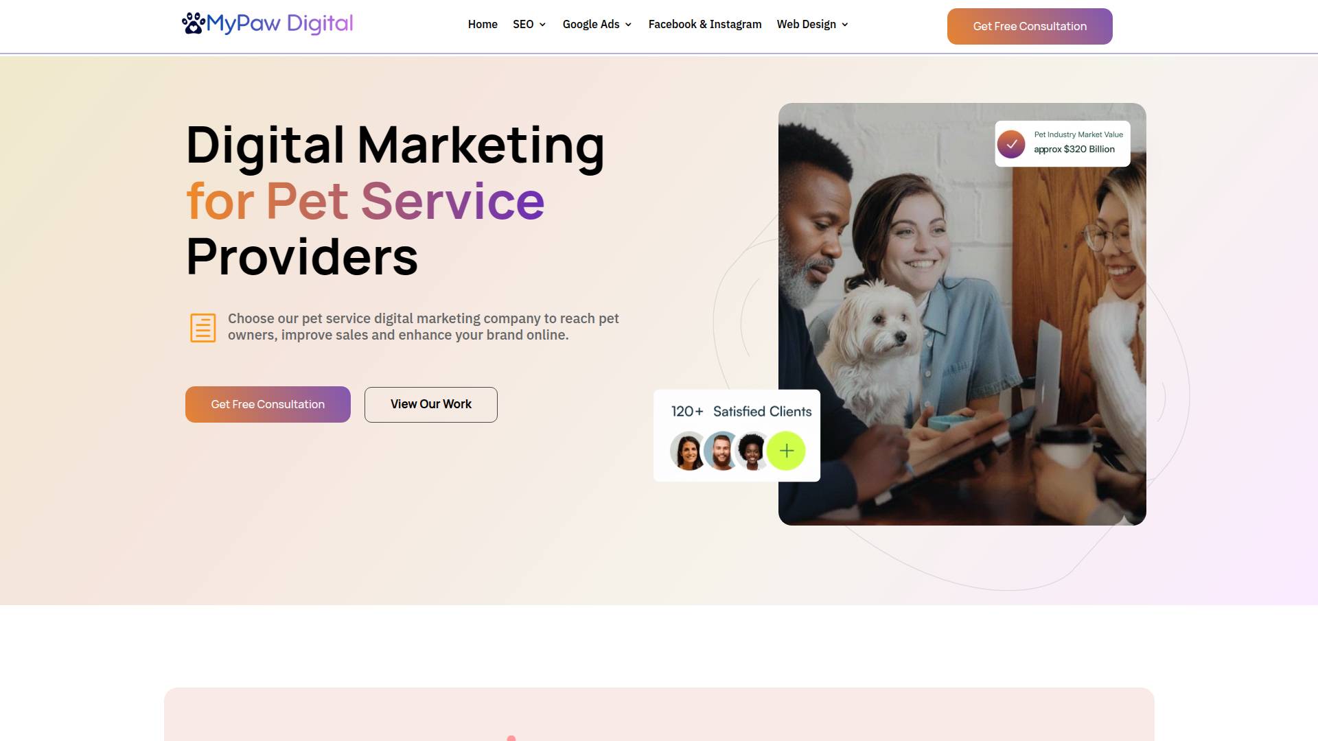 At MyPaw Digital, their services are designed to benefit pet-related services, including veterinary clinics, grooming salons, pet sitters, trainers, and all other pet care services.