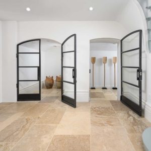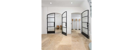 Antiqued French limestone flooring − Our antiqued Bourgogne erosion finish resembles the patina of old and reclaimed stones found and sourced in the Burgundy region of France. The selection of larger format stones with warm complementing tones help to create the luxurious blend sought when creating new and restoring old interior spaces.