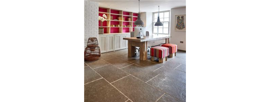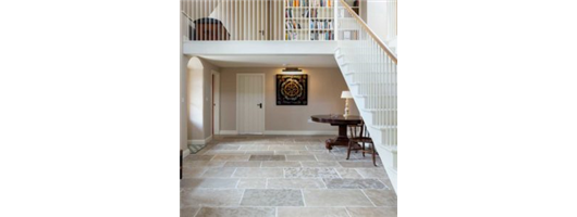 Bampton aged flagstones: Warm greys and cool beiges feature in these flagstones which are subtly aged for a soft, rustic stone floor. Small shell and fossil content adds interest and character to these stones which are supplied in a large format, 600 x random lengths configuration. These are suitable for use outside and inside, allowing them to flow from one space to another.