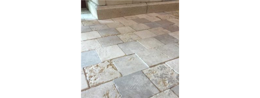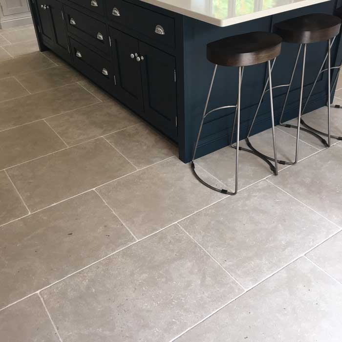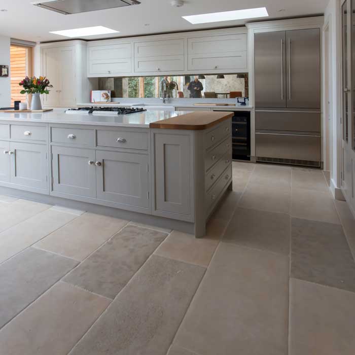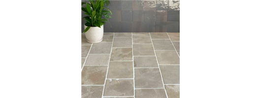 Montpellier antiqued limestone − Authentically finished stone, hand-worked to create completely unique tiles. We specialise in creating time-worn floors to replicate original antique flooring. Montpellier has subtle ageing to both the surface and edge and mixed tones from cream/beige through to grey. A hard wearing limestone for both floors and paving.