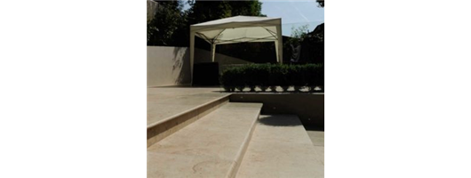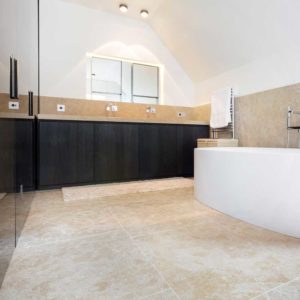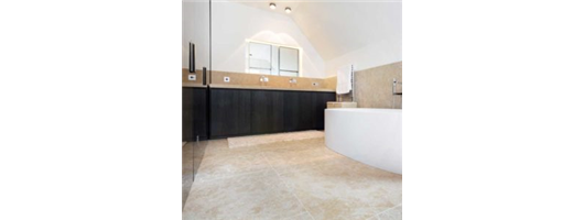 Chambery beige stone tiles − Durable, warm beige stone tiles with scattered fossil content with very slight pitting to the surface. Suitable for interior and exterior − pool copings and treads can also be produced in this material. Available in tumbled or brushed finishes in tile format or larger flagstones.