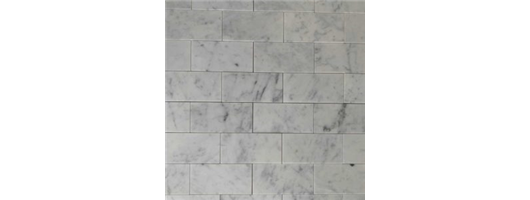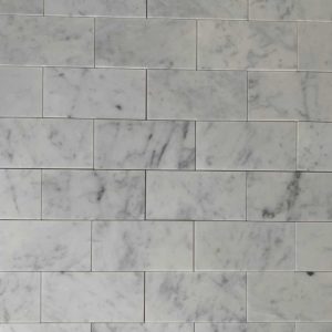 Carrara marble metro tiles: Honed, C-grade Carrara marble tiles in a small brick shape measuring 150x75mm. These can be used on walls and floors, laid in either a brick bond format or in a traditional herringbone pattern. This grade of Carrara marble ensures a whiter background with more defined grey veining throughout, giving these decorative tiles a beautiful, understated elegance. We also stock Carrara marble floor and wall tiles in 300 x 152mm.
