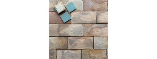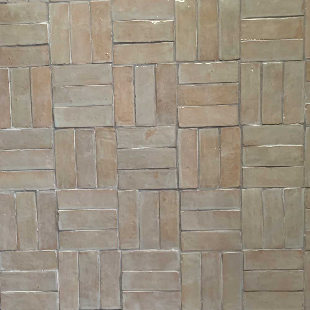 Glazed clay Bejmat tiles: Our glazed clay Moroccan Bejmat tiles have a rich icing-like glaze over the surface and edge showing the warm subtle tones of the oven-fired terracotta beneath. Tones resemble a light pale clay. Bejmat tiles can be laid in a number of formats including brick bond, herringbone, double herringbone and more.