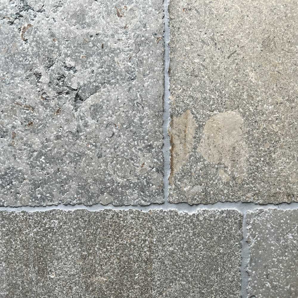 Jura Grey limestone paving: Sandblasted and brushed limestone tiles which are durable and perfect for use outside. Each tile has individual character thanks to their beautiful fossil and shell detailing.