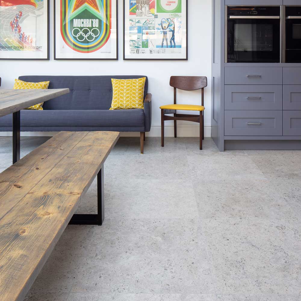 Hanover blue grey honed limestone: A blue grey limestone with warm undertones and subtle fossils throughout. These honed tiles feature straight cut edges to create a smooth, sharp floor finish while also ensuring the beauty of the natural material shines through. This is a highly durable stone suitable for areas of high footfall. Many size options are available as well as bespoke items such as steps and treads.
