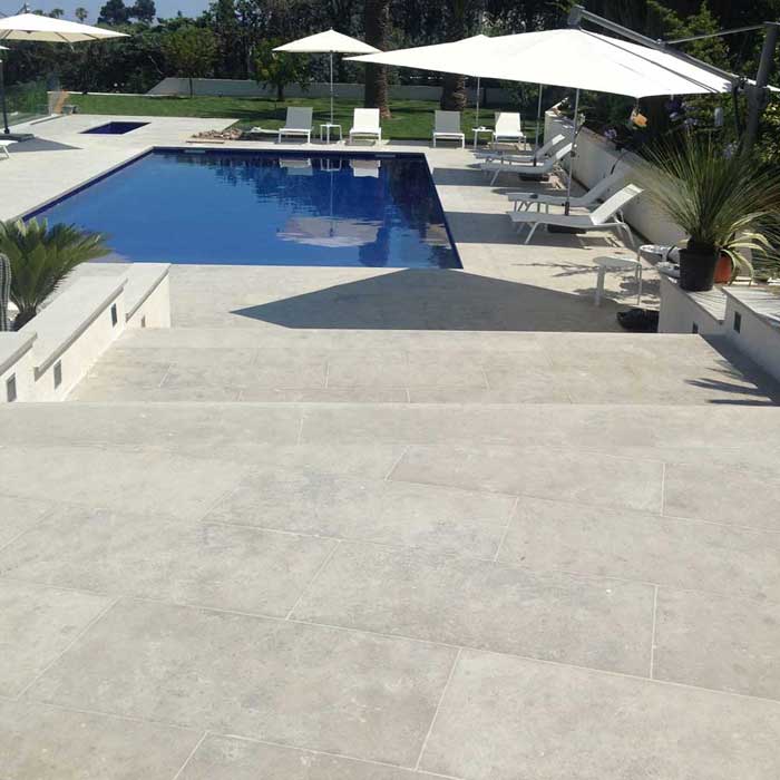 Chalon Grey limestone tiles − A consistent light to medium grey stone with a hint of blue tone and cloudy appearance. This antiqued tumbled natural flagstone tile lends itself to both classic or modern settings and can be for interior or exterior use. Pool copings and treads can be produced in the same material. Our Chalon grey limestone pavers in 150 x random lengths x 20mm are also a perfect complement to these tiles.