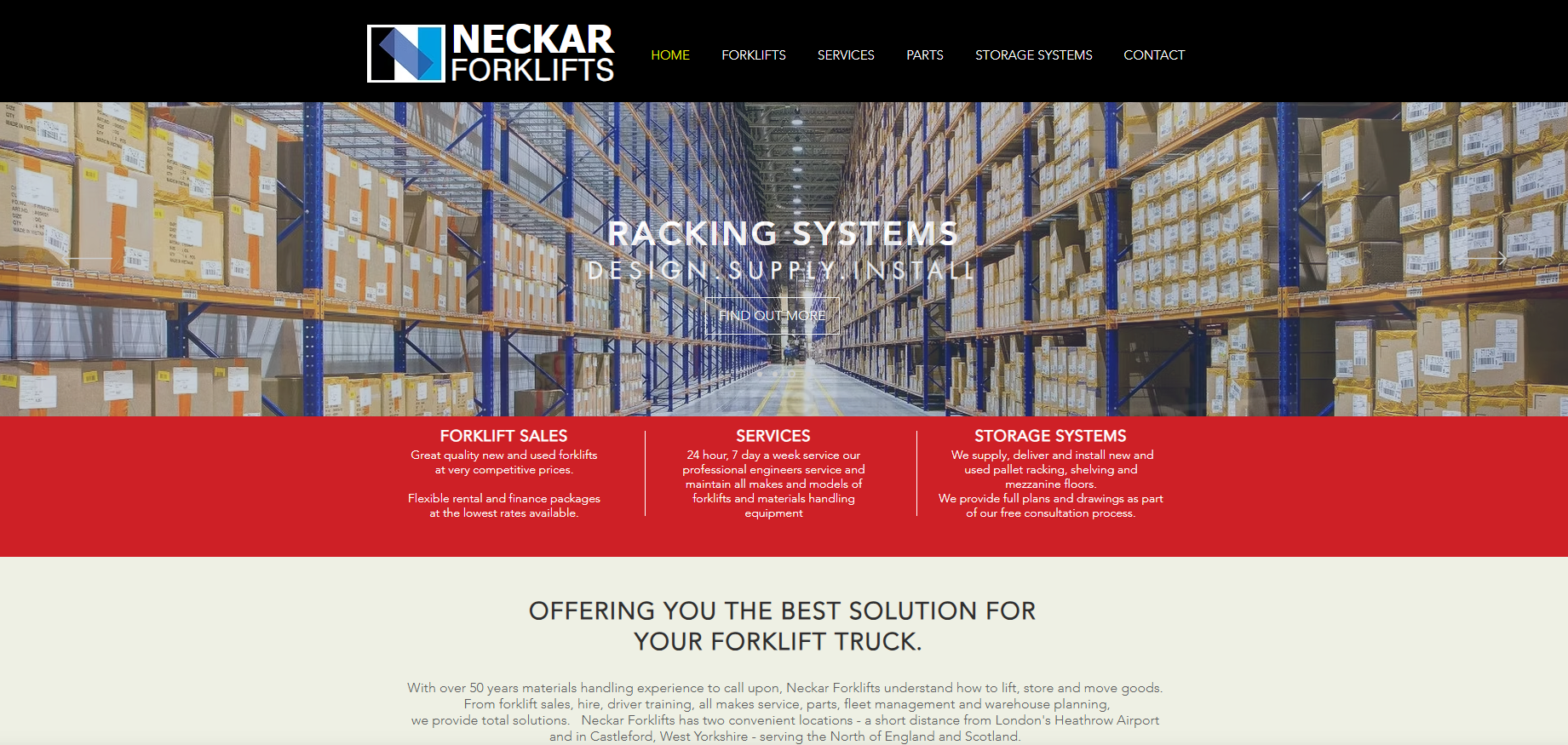 From forklift sales, hire, driver training, all makes service, parts, fleet management and warehouse planning, we provide total solutions. Neckar Forklifts has two convenient locations - a short distance from London's Heathrow Airport and in Castleford, West Yorkshire - serving the North of England and Scotland.
