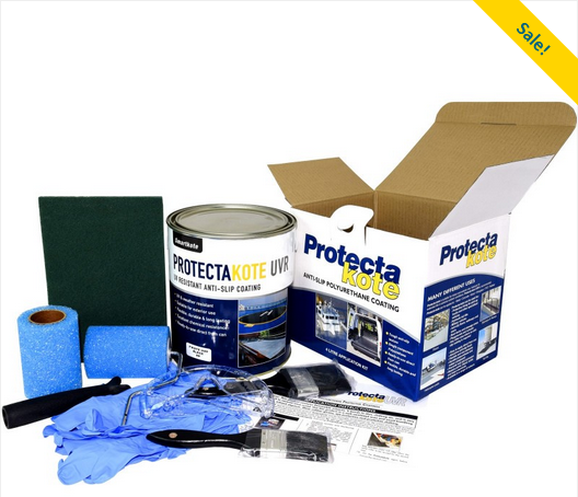 Protectakote UVR offers all the same advantages as standard Protectakote (tough, flexible, wear resistant and anti-slip) but by using different resins (aliphatic) has 40% higher strength, improved wear resistance, a 50% quicker drying time and most importantly has excellent resistant to the effects of UV light and weathering making it suitable for harsh environments like the decks of ocean going yachts or a rooftop walkway or balcony.