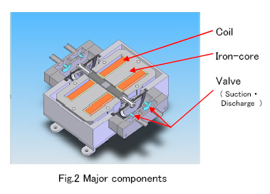The coil will attract the left magnet that has the opposite pole, and thus the left diaphragm pushes out the air in the cavity through the discharge valve and further to the outlet port. At the same time, the diaphragm on the right is pulled up by the attraction of the other magnet and air comes in through opened suction valve.