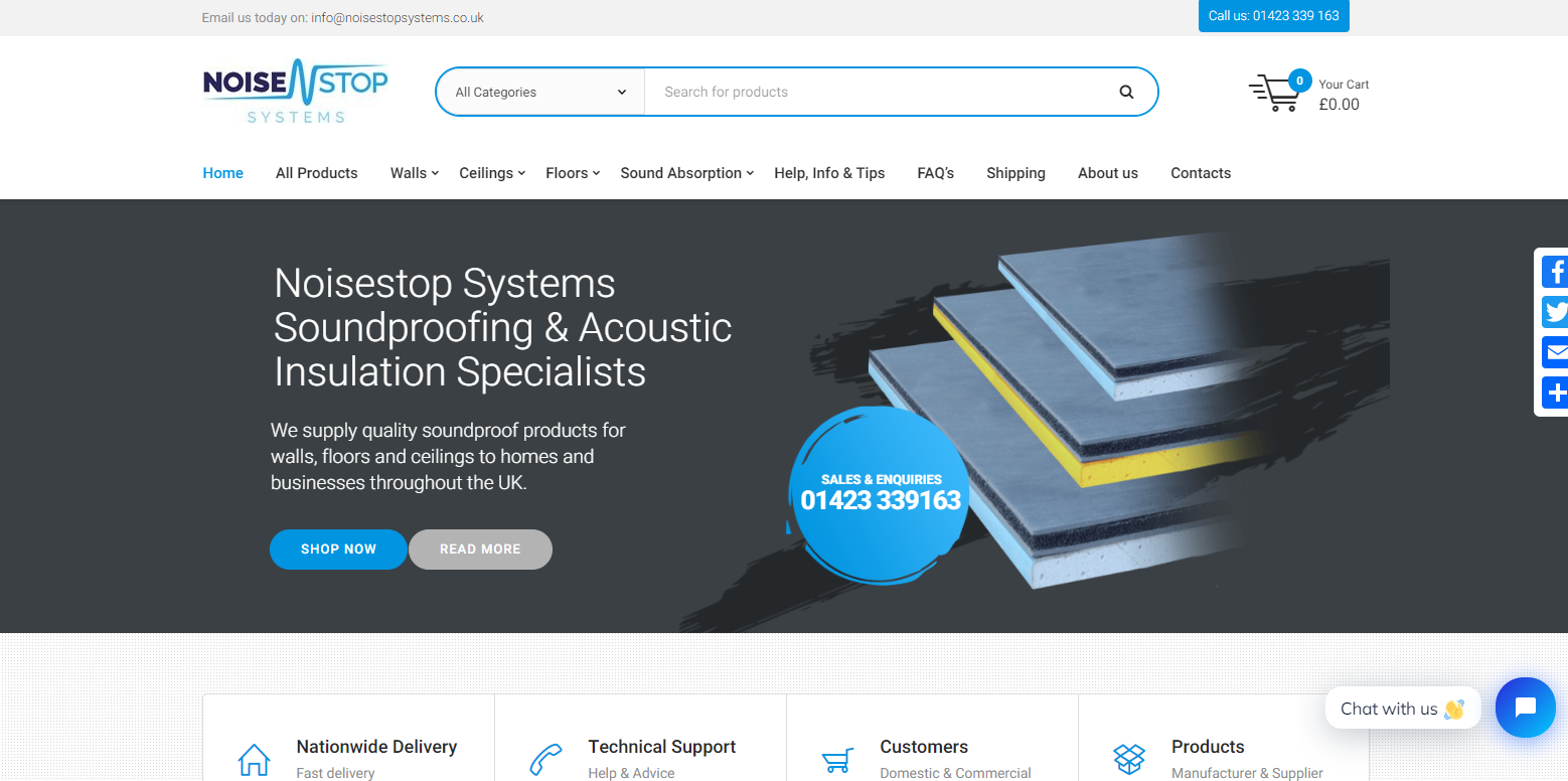 Noisestop Systems is one of the UK’s leading providers of sound proof walls, ceilings and floors. We supply products to assist soundproofing projects for homes and businesses throughout the UK. Our acoustic insulation product range is ideal for DIY soundproofing and commercial customers. Take a look through our large range of products or learn more about how to soundproof a room with our handy online guides. Alternatively, speak to one of our friendly advisers