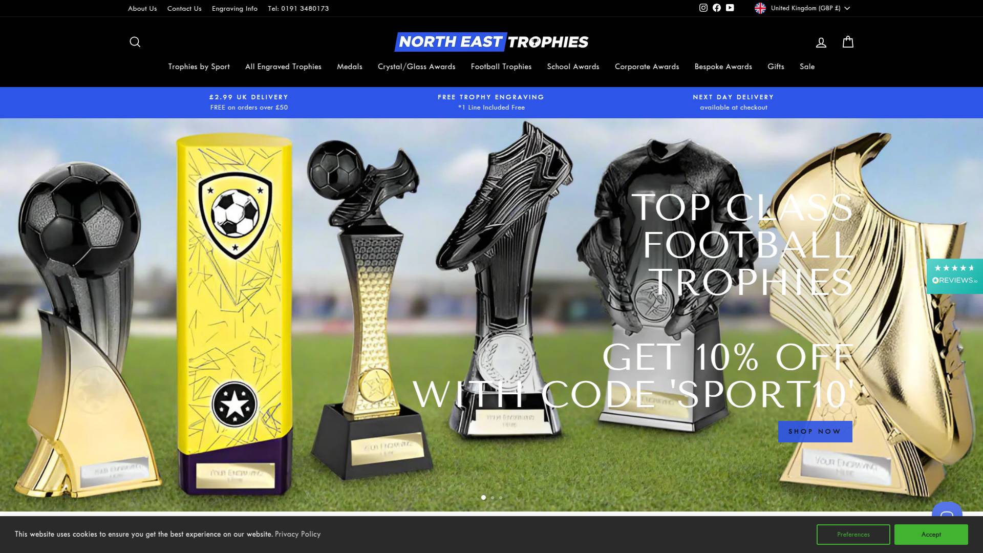 Engraved trophies & medals with free UK delivery. We are proud to be based locally in the North East of England and we serve hundreds of local sports teams, schools and businesses with their annual trophies and awards. If you are in the area and looking for a local engraving company, give us a call. Our customer service team is always happy to help. We can work with you to choose the perfect awards, trophies or glass and our designers can help bring your ideas to life, from inception to final layout before engraving.