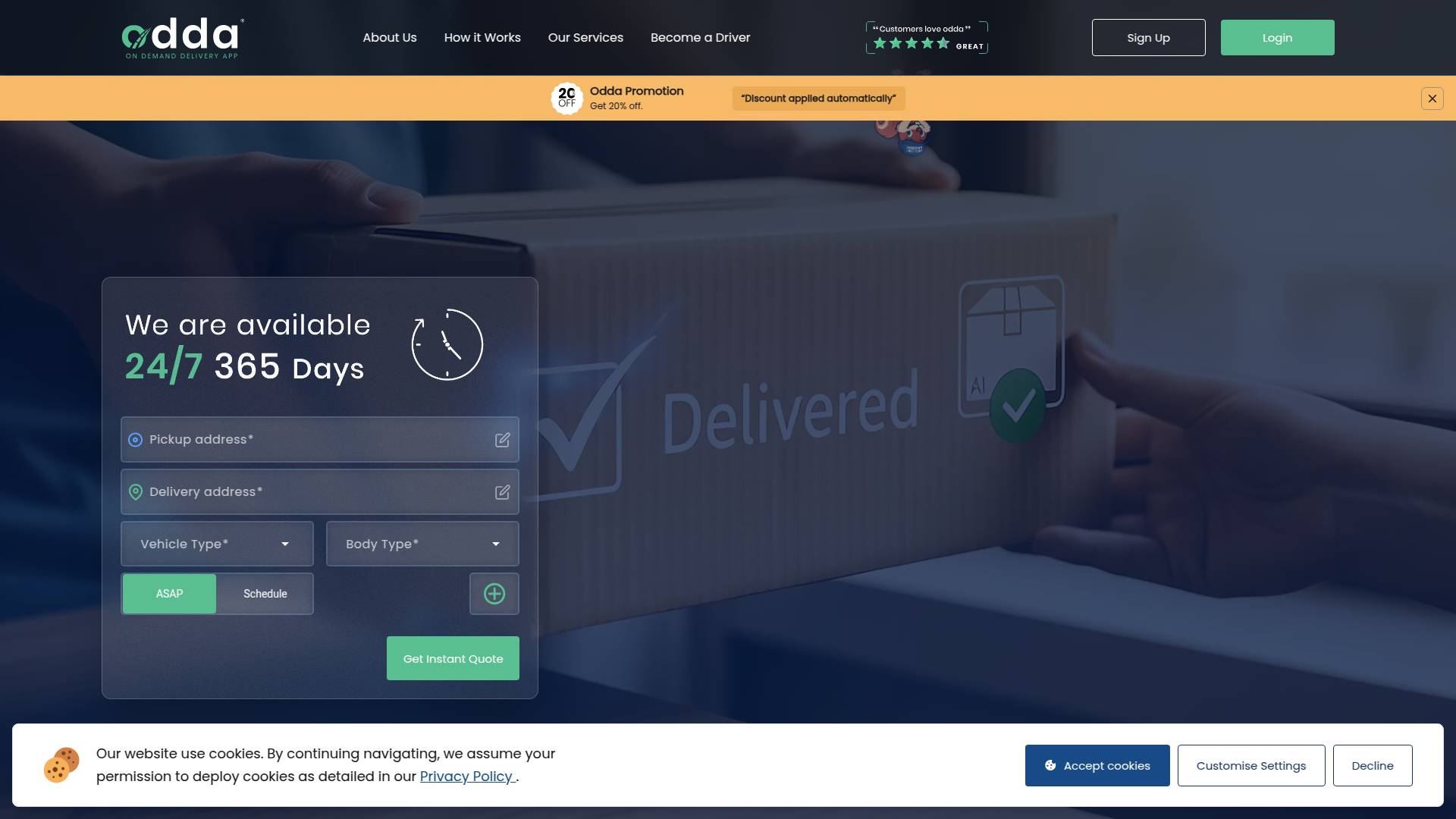 Odda connects you with drivers across the UK, whenever you need something picked up and delivered or dropped off and picked up. It’s quick, simple, and you get instant quotes, direct contact with your driver, plus real-time tracking every step of the way for your sameday deliveries.