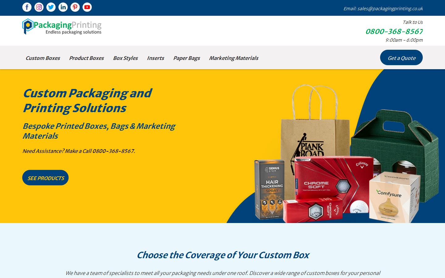 PackagingPrinting is a well-known company that produces custom packaging boxes in the UK. Every startup needs the perfect packaging for their product, which promotes their development nicely and protects them from damage. We make all types of custom boxes in any shape and design. PackagingPrinting offers a free design service and shipping across the UK, so don't waste your time and contact us to get the packaging you want.