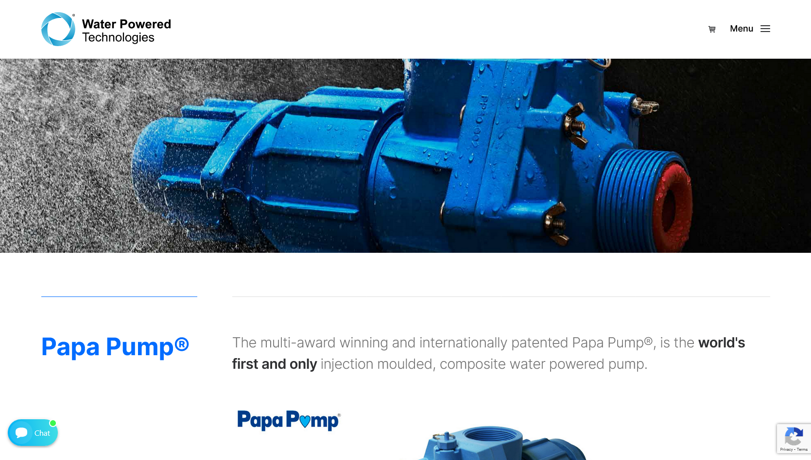 Our front runner product, The Papa Pump®, is an innovative and award winning Water Powered Pump, which has been sold and installed by thousands of customers globally, providing positive financial, environmental and social impacts to individuals, businesses and communities.