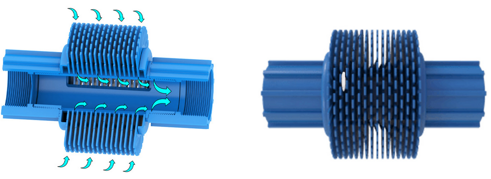The parallel structure of the discs in the Seradisc® screen interfere with the circular formation of a vortex forming. The outer surface area of the Seradisc® filter screen is extremely large, so the velocity of water flow at any given point is relatively low. This dramatically reduces the likelihood of a vortex from forming from any point on the outer surfaces.