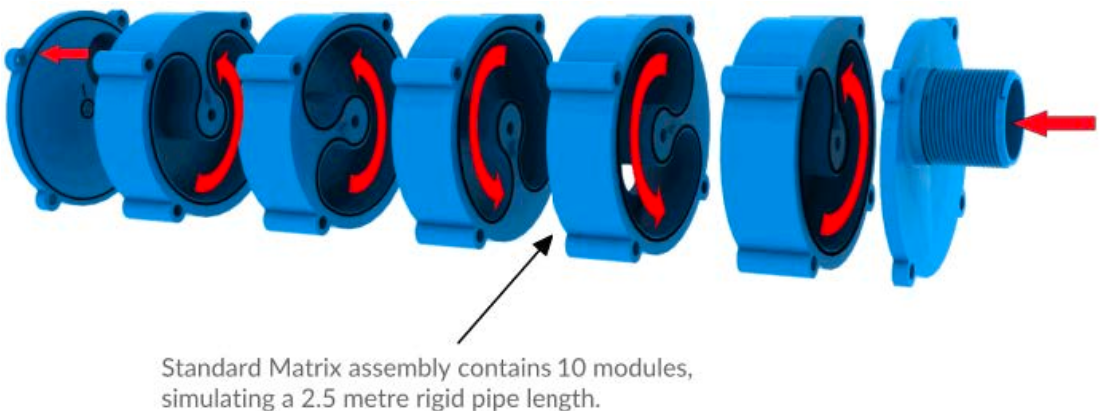 The Matrix increases the effective length of the supply pipe so that when the pump valve closes, the mass and momentum of the fluid is greater, thereby increasing the potential pressure increase in the delivery. (A standard Matrix module is 500 mm long simulating a 2.5m rigid pipe length).
