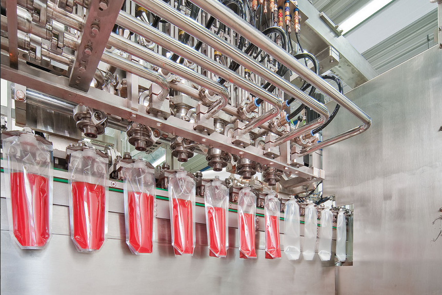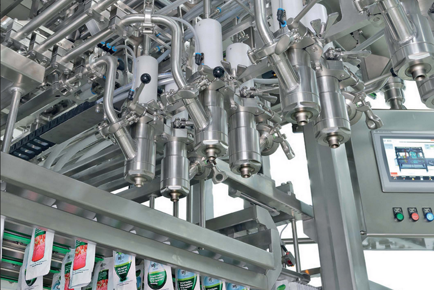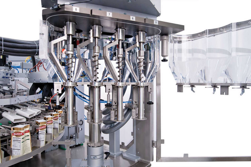 Our technically advanced intermittently operating rotary machines include the filling and sealing machines FS 824 to FS 840, each of which has eight stations. They fill and seal prefabricated flat bags or stand-up pouches with products of very different consistencies and are also able to have spouts attached.