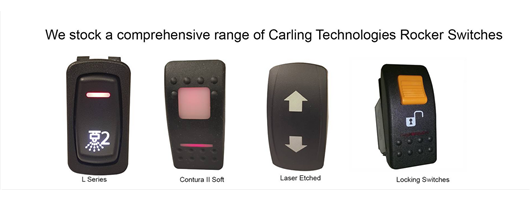 Pennine Components Ltd are UK authorized distributors of Carling Technologies. We specialize in the Contura II and Contura V laser etched automotive Rocker switch ranges, offering a wide range of standard and custom legends, all with IP67 front panel sealed, with 12Vdc 20A or 24Vdc 15 A rating.