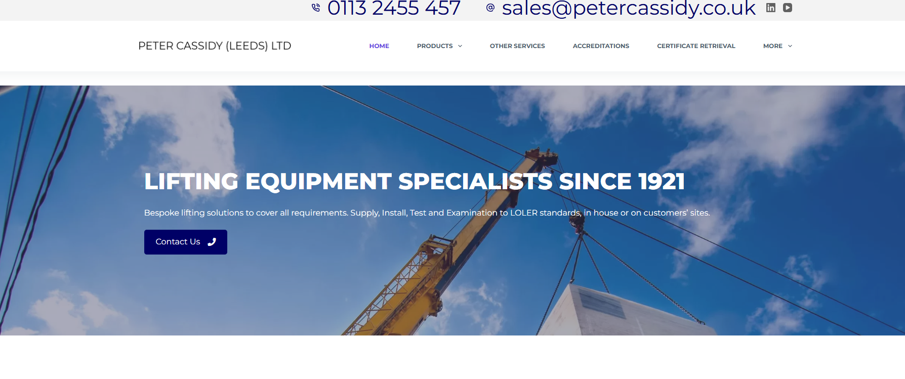 Peter Cassidy (Leeds) Ltd are a long established lifting equipment specialist who originated in Hull in 1921 and are now based in Leeds, serving both the UK and World Wide. We are certified to ISO 9001: 2015 Quality management systems, ISO 14001: 2015 Environmental management systems and also ISO 45001: 2018 Health and Safety management standard and are active members of the Lifting Equipment Engineers Association (LEEA)