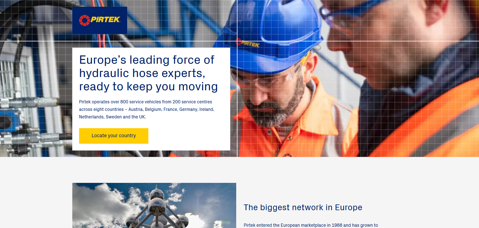 Pirtek entered the European marketplace in 1988 and has grown to become Europe’s number one provider of on-site hydraulic hose replacement services. Pirtek Europe has more than 200 service centres and a fleet of approximately 800 mobile service vehicles operating across eight countries – Austria, Belgium, France, Germany, Ireland, Netherlands, Sweden and the UK. Pirtek’s mission is to provide the fastest and most convenient service available, 24 hours a day, 365 days a year. It offers a comprehensive range of products and services across many market sectors.