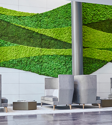 Sustainably harvested from Scandinavian forests and suitable for installation in almost any indoor space, preserved moss can be dyed in a wide array of colours, and combined with other elements such as 3D forms, lighting and signage to create striking art installations.