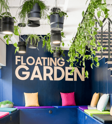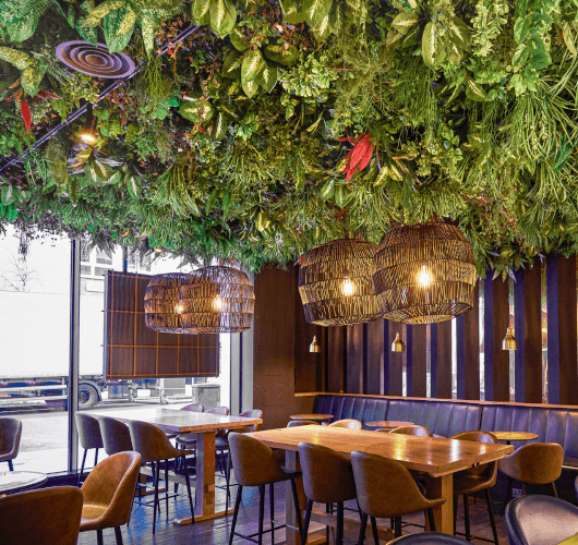 Make a statement with a green ceiling, using replica plants suspended overhead, to evoke a powerful connection with nature.