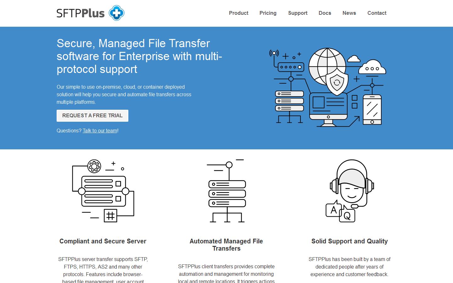 Software development, sales and support for SFTPPlus. Solution provides managed secure file transfer across internet & networks. Supports SFTP, SSH, FTPS, AS2, HTTPS etc for multi platforms including UNIX, Linux, Windows. Server & Client modules with audit, authentication, automation etc.