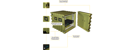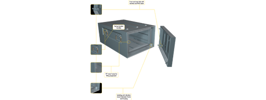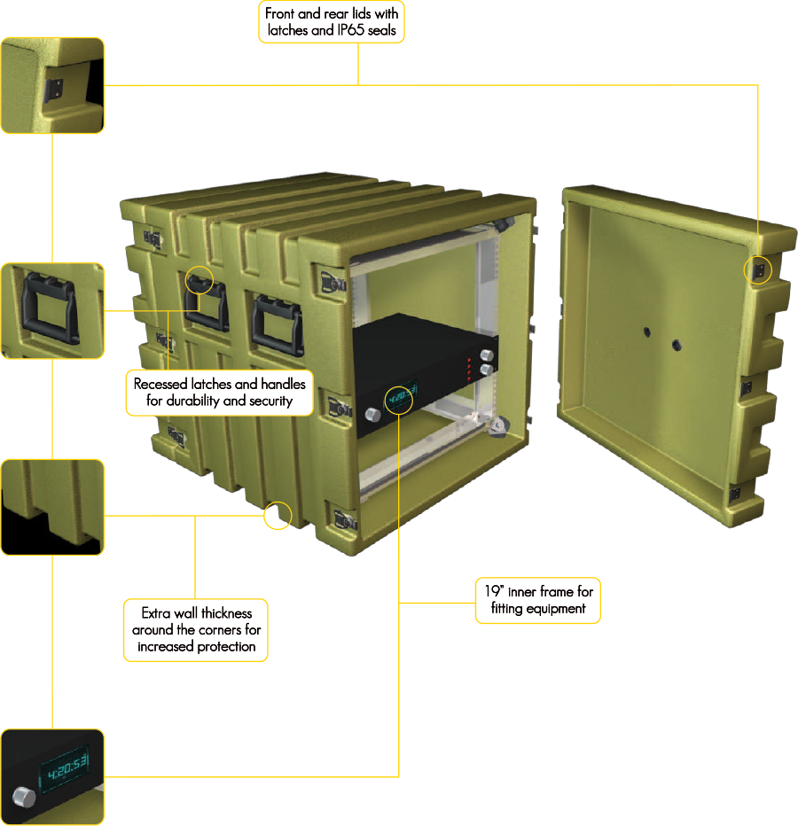 Rotationally moulded polyethylene enclosures with front and rear access lids, fitted with 19″ shock mounted frames to give protection from mechanical stresses including shock, impact and vibrations.