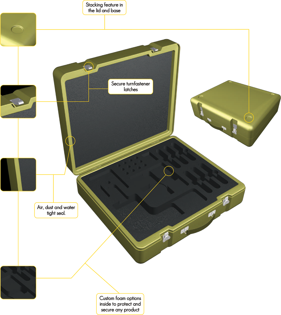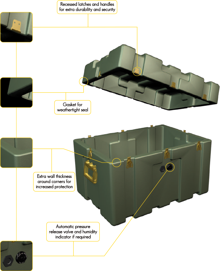 Meeting ATA300 category 1 and applicable parts of MIL-T-28800, MIL-C4150 and MIL-Std-108, these containers are manufactured from rotationally moulded polyethylene plastic to protect the most sensitive equipment in the harshest of environments, these containers offer a robust alternative to traditional shipping crates and flight cases.