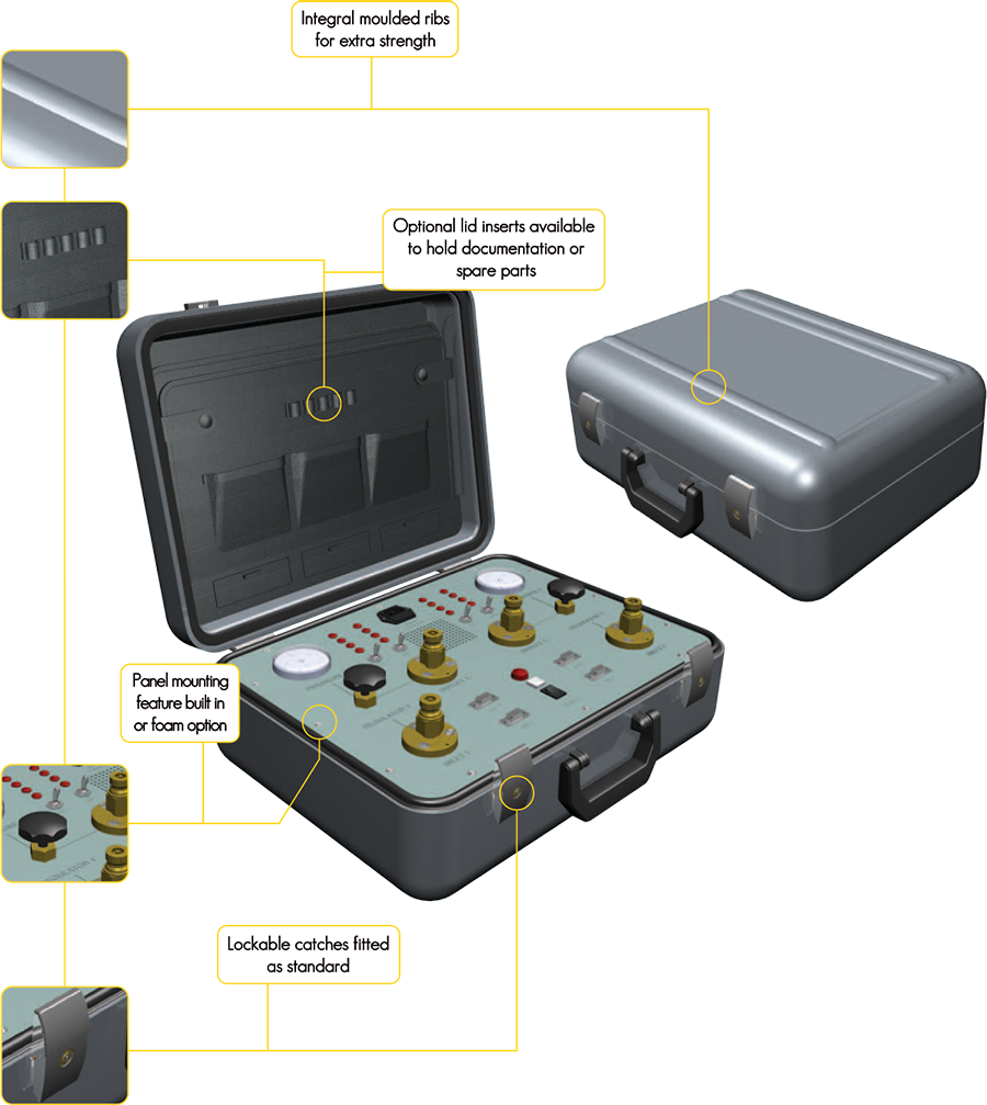 These cases are weatherproof and fitted with lockable catches as standard. Blank mounting panels are available from stock, complete with QED’s unique fixing system, which allows for quick assembly. Custom panels can also be supplied pre-machined and printed to your specification.