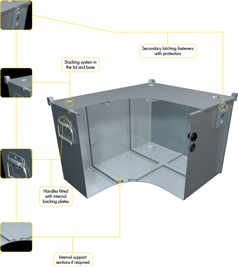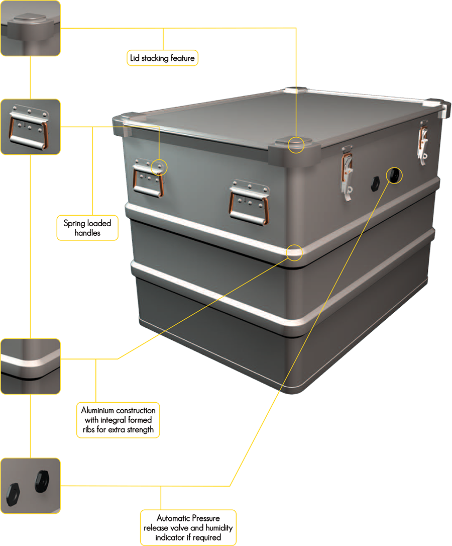 Handles, turnfasteners, automatic pressure relief valves and humidity indicators are all recessed within the container walls for improved protection.