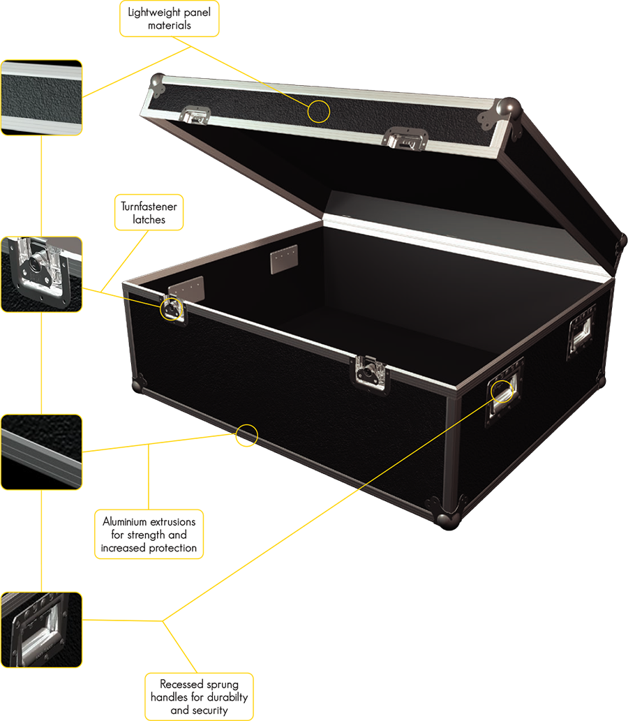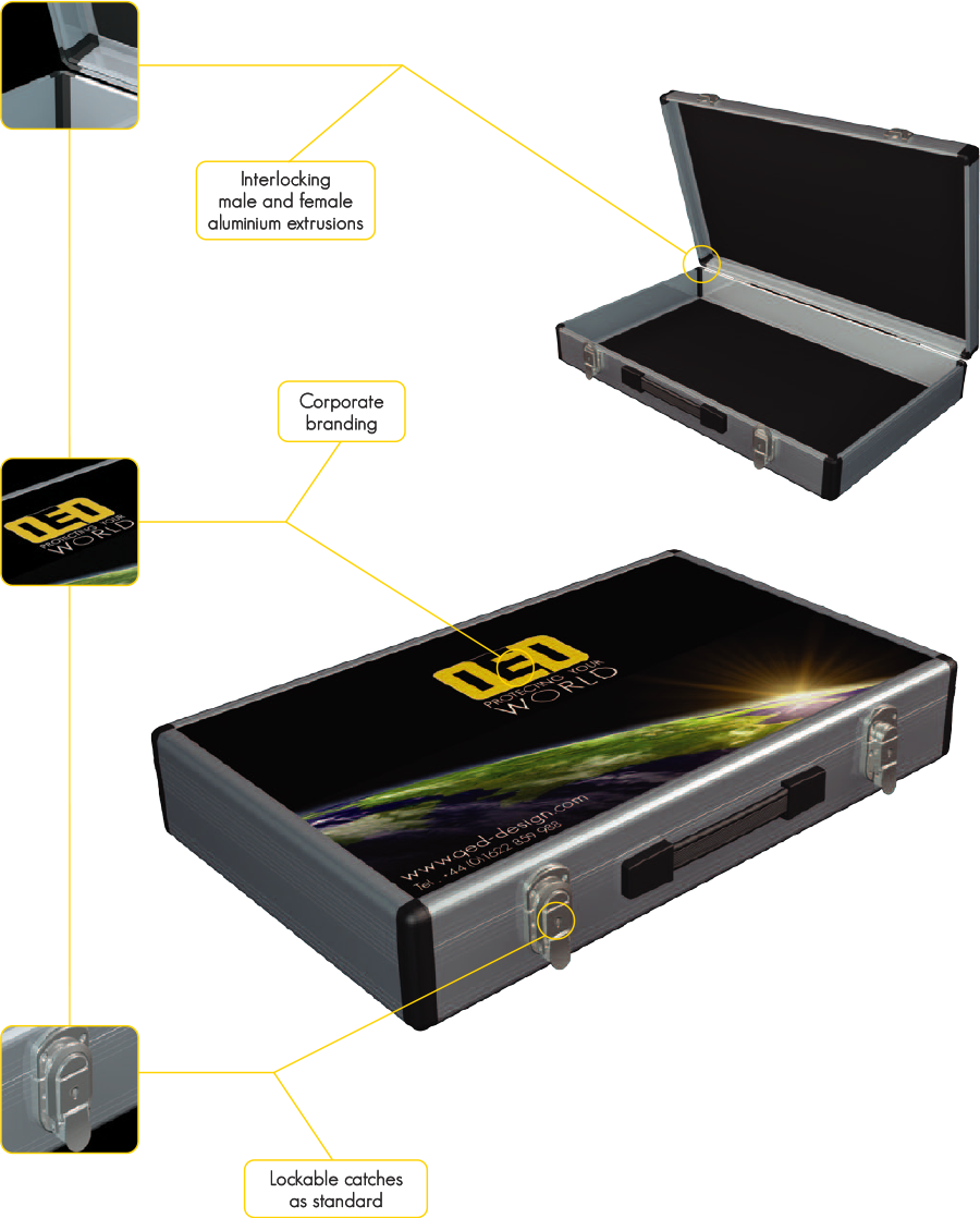 These attractive and versatile cases are produced in twelve standard sizes. Aluminium effect in appearance and manufactured from tough self-coloured ABS plastic, they retain their good looks for the life of the case.