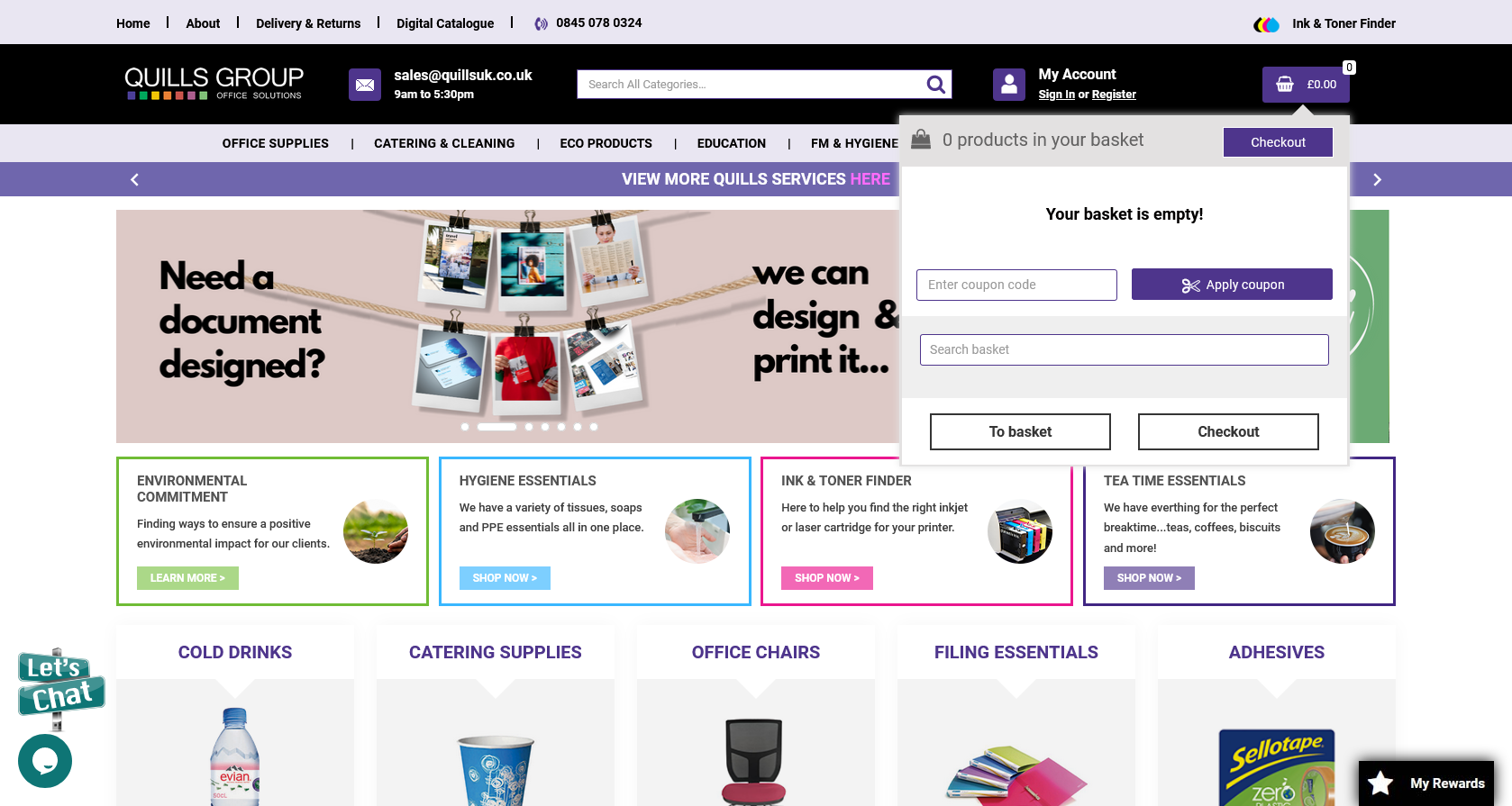 Established business supplies and facilities management specialists, Quills Group have over 25 years’ experience in the distribution of high-quality workplace supplies including office equipment, catering, furniture and janitorial products. Based in the UK, our company employs a dedicated team of professionals who are able to look after our customers and to ensure that their needs are met as efficiently as possible. Over the years, our company has gone from strength to strength, providing your key business solutions including archiving, shredding, copiers, printers, promotional goods, print and design, coffee & beverage solutions, catering and events, cleaning and hygiene services, FM and furniture. We have long standing relationships with many of our customers as their preferred purchasing partner of choice, which has given us an outstanding reputation throughout the industry.