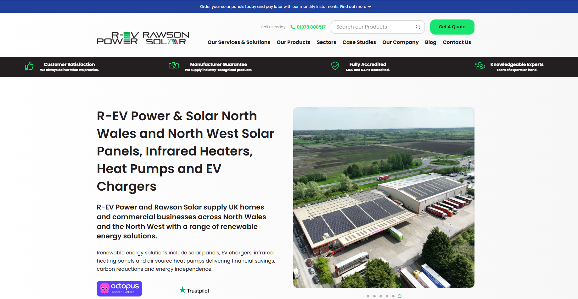R-EV Power and Rawson Solar are a Wrexham based business that supplies and supports homes and commercial businesses, large or small, with renewable energy solutions. We are a supplier and installer of domestic and commercial EV chargers, solar panels, battery storage, air source heat pumps and infrared heating panels. Our mission is to help you reduce carbon emission, and financial costs while increasing your energy independence. We operate across Bangor, Wrexham, Chester, Liverpool, Manchester and the surrounding areas of North Wales and the North West. As well as Birmingham.
