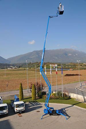 It has an Articulated boom (with 2 elements), a telescopic boom (main boom + 2 extension) and a Jib. It has Dual drive speed and Electro-hydraulic steering from the ground with radio control and electro-hydraulic controls in the basket. Extending track widths and variable/narrow jacking enables use in restrictive environments even with uneven ground.