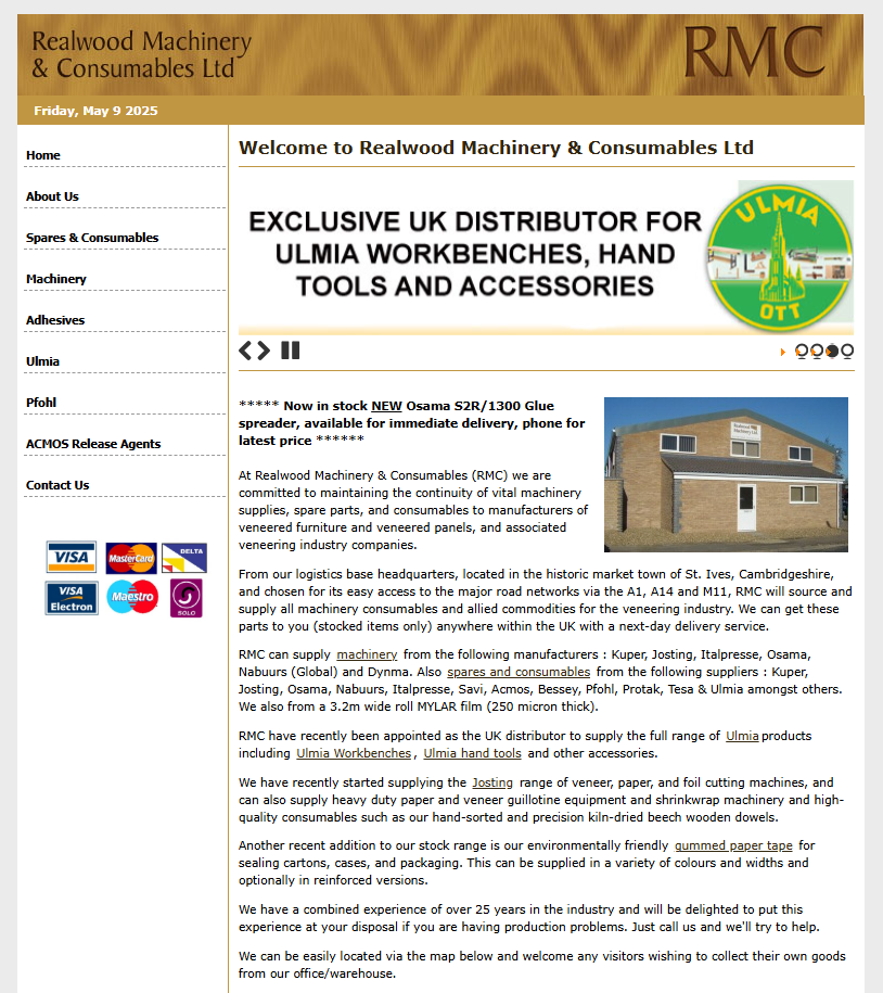 From our logistics base headquarters, located in the historic market town of St. Ives, Cambridgeshire, and chosen for its easy access to the major road networks via the A1, A14 and M11, RMC will source and supply all machinery consumables and allied commodities for the veneering industry. We can get these parts to you (stocked items only) anywhere within the UK with a next-day delivery service.