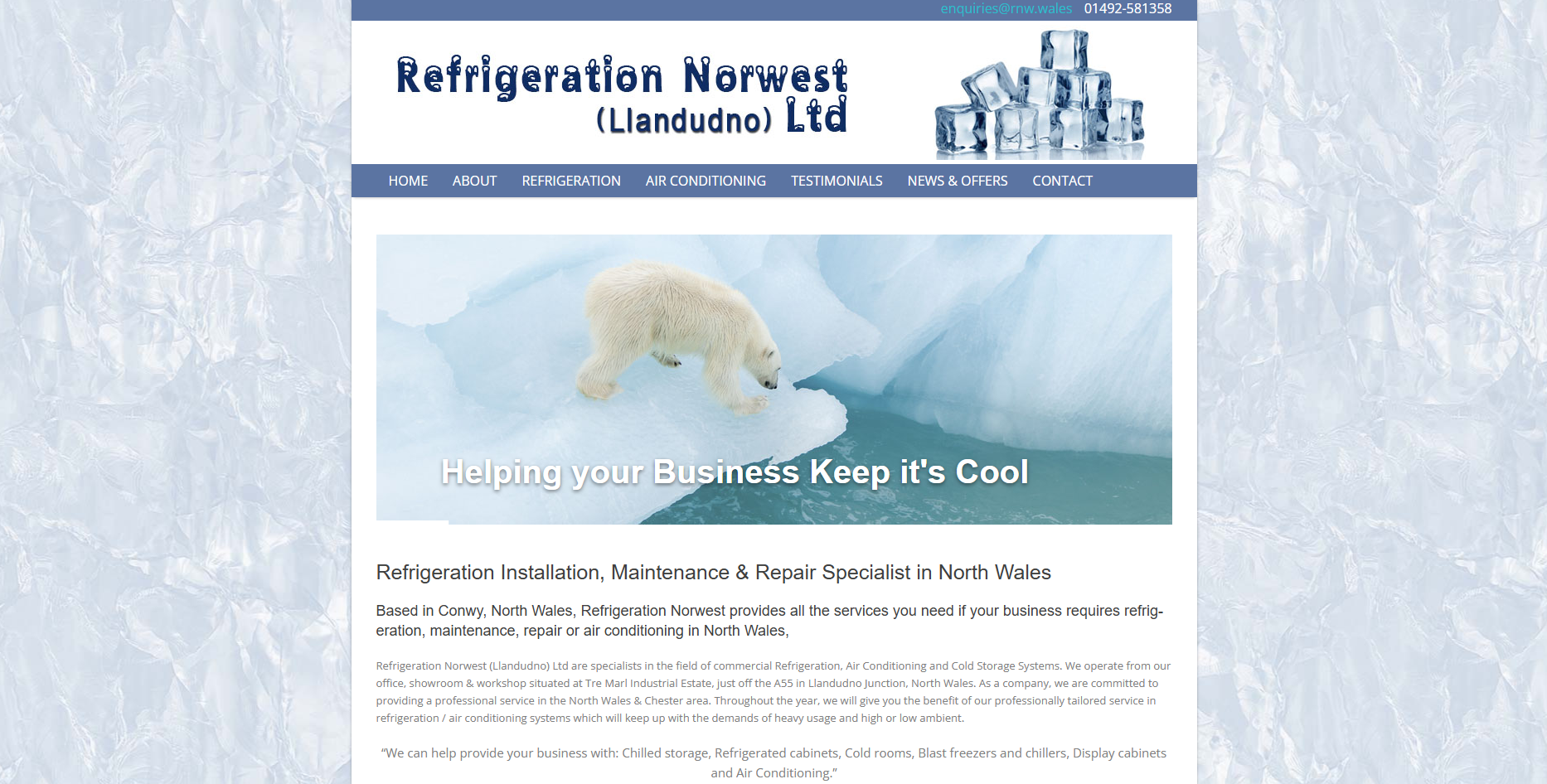 Refrigeration Norwest (Llandudno) Ltd are specialists in the field of commercial Refrigeration, Air Conditioning and Cold Storage Systems. We operate from our office, showroom & workshop situated at Tre Marl Industrial Estate, just off the A55 in Llandudno Junction, North Wales. As a company, we are committed to providing a professional service in the North Wales & Chester area. Throughout the year, we will give you the benefit of our professionally tailored service in refrigeration / air conditioning systems which will keep up with the demands of heavy usage and high or low ambient.