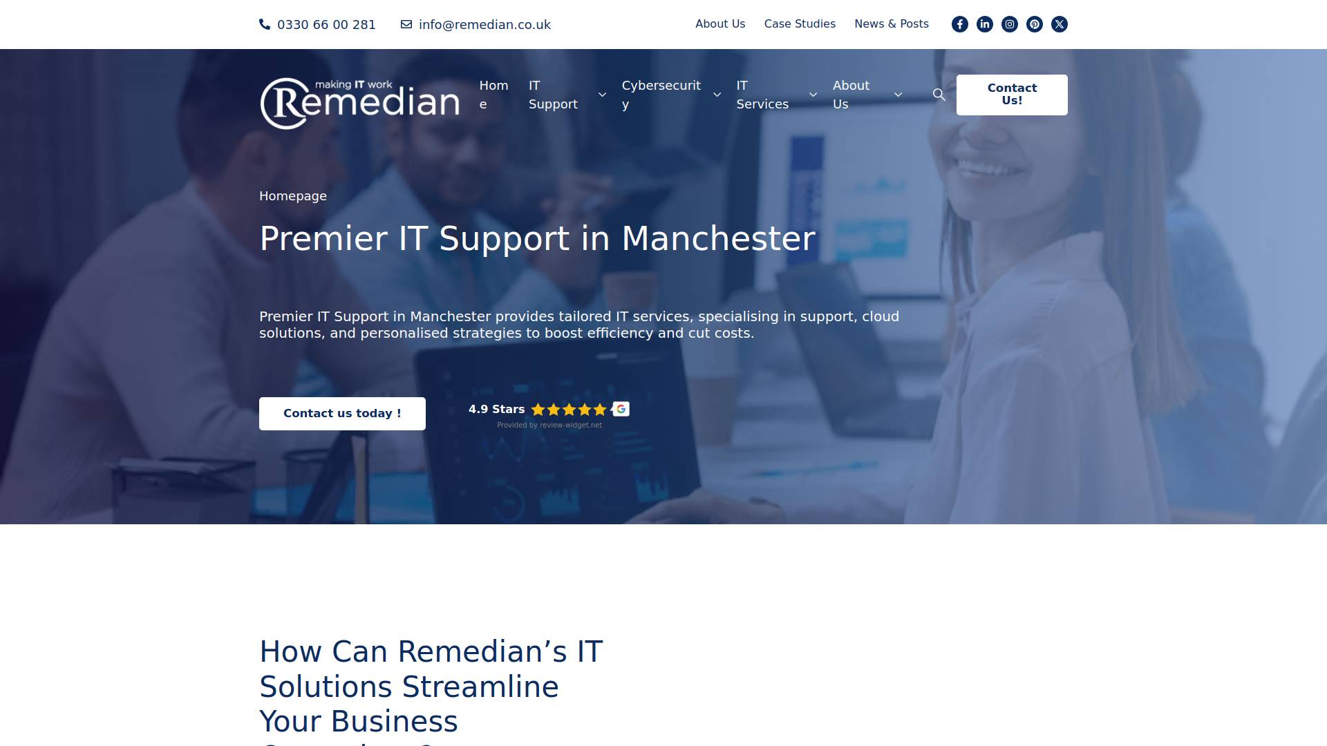 Remedian, an award-winning IT support provider in Manchester, offers tailored solutions to boost productivity and enhance security for businesses and schools. Our services include IT support, managed services, IT consultancy, Cyber Essentials certification, and cloud solutions. For schools, we provide network management, device deployment, learning platform integration, data protection, and digital literacy training. Get in touch with us at info@remedian.co.uk to schedule a free consultation and learn how Remedian can help transform your organization in the digital era.