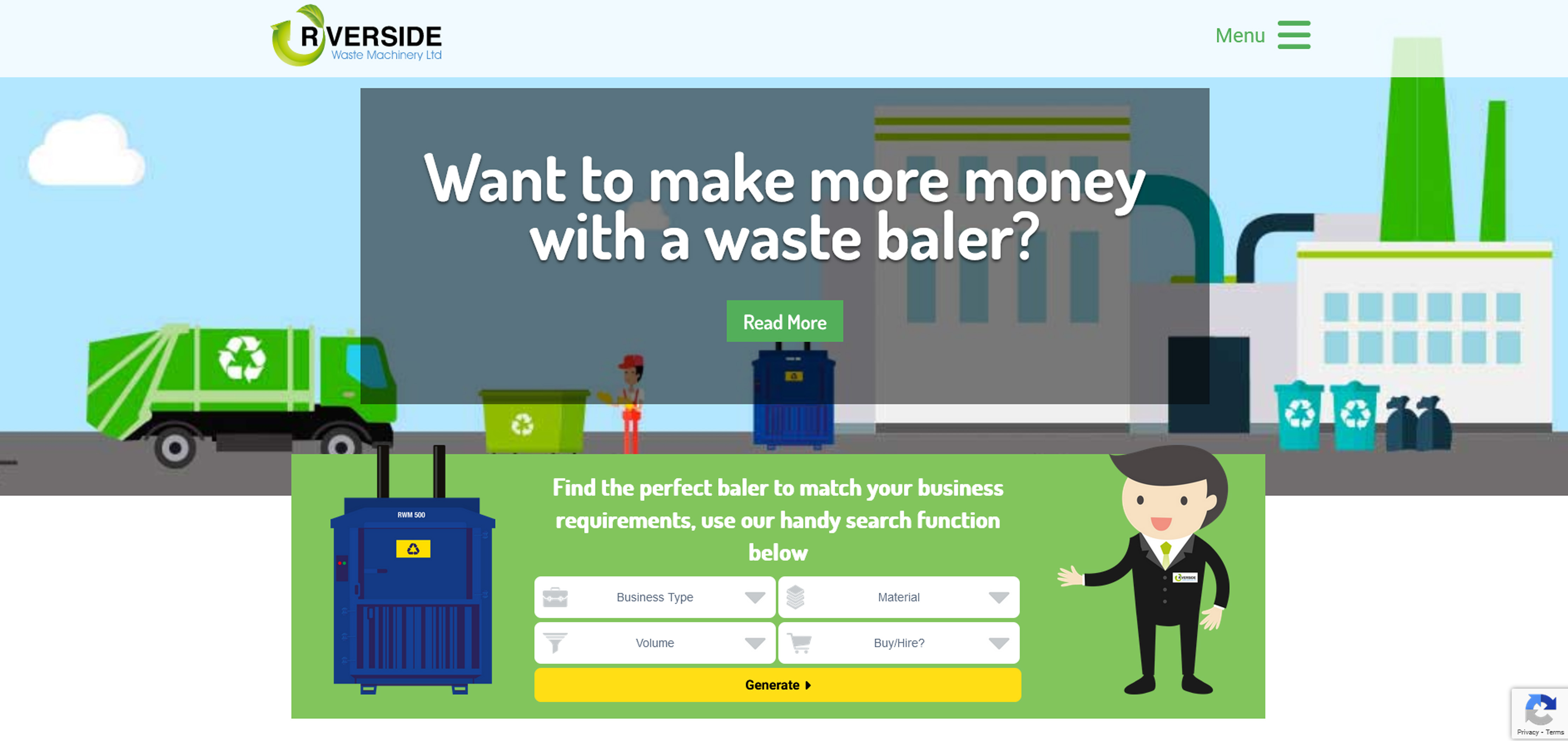 Riverside Waste Machinery offers a vast array of products and services, such as mid-range waste balers, heavy duty waste balers, used balers, waste machinery, compactors, bag presses, drum presses, bin presses, glass crushers, mill size waste balers, cardboard balers, plastic balers, compact waste balers, horizontal waste balers, waste baler hire, operator training, service and maintenance, spare parts, waste handling consultancy, baler refurbishment, multi-chamber waste balers, baling wire, baling twine, baling tape and clear polythene sacks.