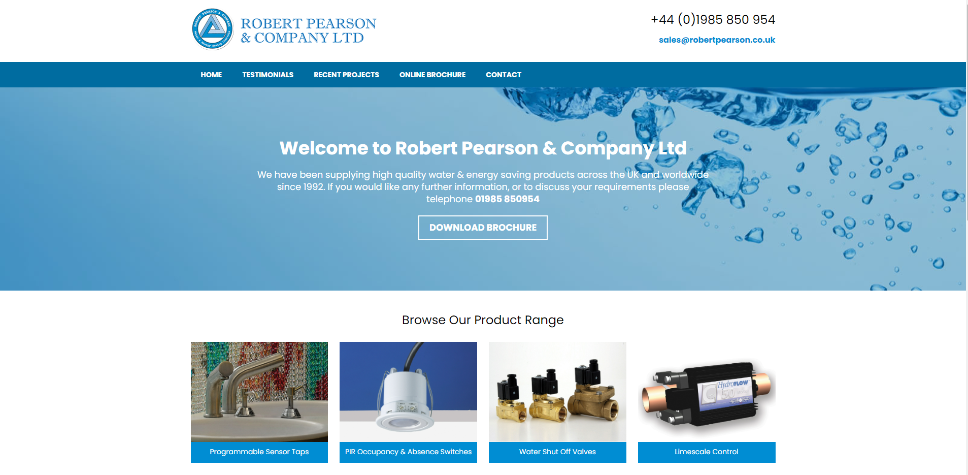 Established in 1992, Robert Pearson was formed to meet the demands of the commercial and domestic industry providing practical, energy saving water products such as Water flow regulators, Electronic limescale control, PIR switches, PIR urinal controls, Sensor taps, Sensor WC flush, Shut off valves, Soap dispensers, Tap, shower & bath sensors and Urinal flush valves to name a few.