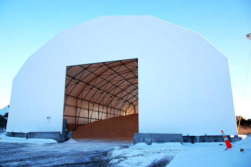 The hot dip galvanized steel frame and high tenacity PVC covering membrane require very little maintenance. Rubb salt storage sheds are specifically designed to withstand difficult environmental and corrosive conditions and have much lower maintenance costs than traditional storage facilities.
