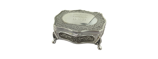 This beautifully crafted personalised silver-plated trinket box features an elegant antique finish and can be engraved with your own special message. One of our most popular selling jewellery boxes, it makes the perfect present for birthdays, weddings, anniversaries, or any special occasion.