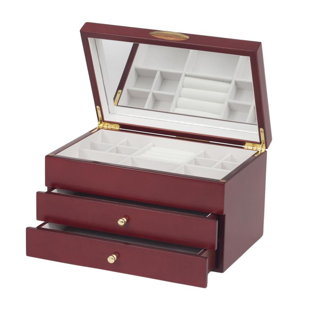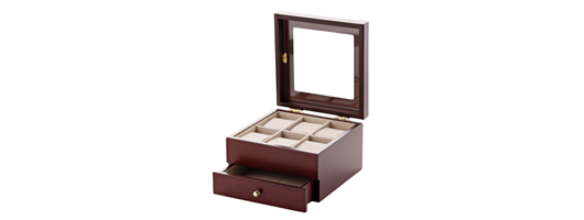This exquisite wooden box features a viewing window in the lid and a beige interior.