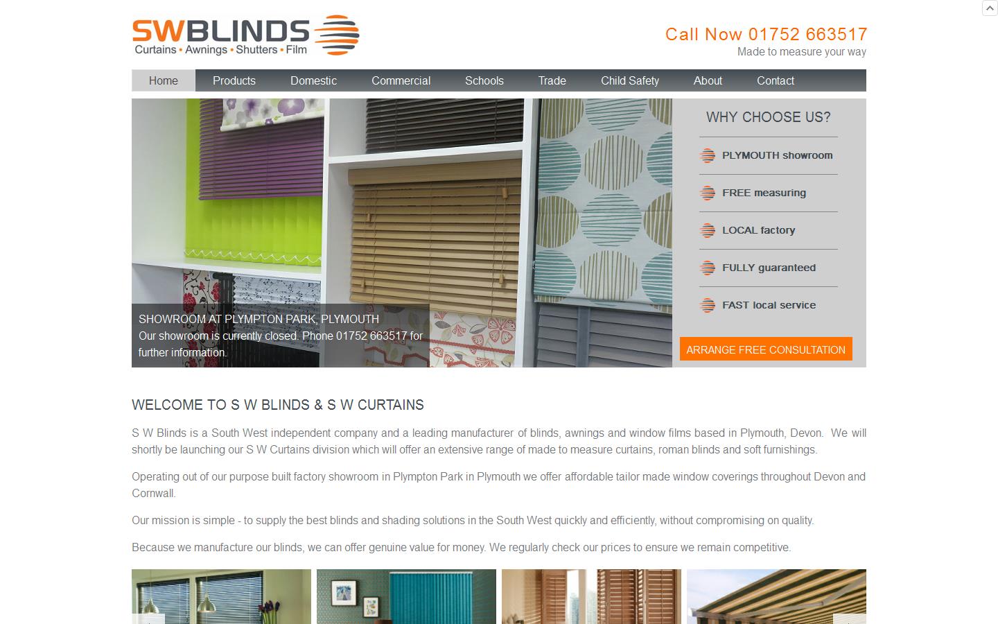 S W Blinds is a South West independent company and a leading manufacturer of blinds, awnings and window films based in Plymouth, Devon. We will shortly be launching our S W Curtains division which will offer an extensive range of made to measure curtains, roman blinds and soft furnishings.