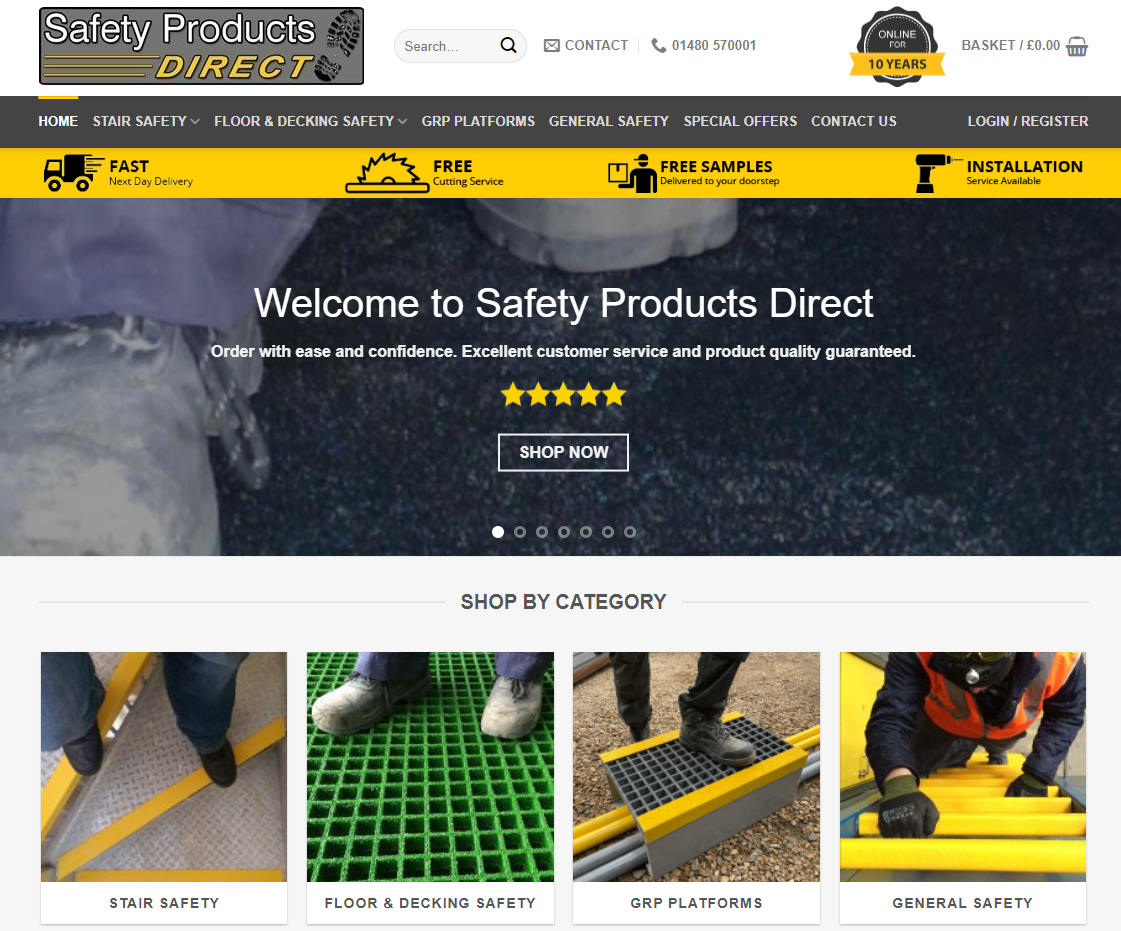 www.safetyproductsdirect.co.uk is a one stop online shop where you can purchase products for anti slip and safety compliancy. Items such as portable GRP Stair Nosings, Stair Tread Covers, Decking strips, Grating, Flat Sheets and bespoke GRP step over platforms to name a few.