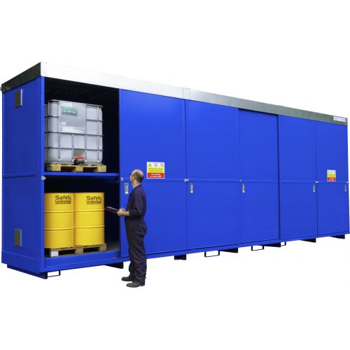 New to our product range are the dual purpose and multi purpose storage units, manufactured to highest quality standards ensuring the safe storage of flammable liquids and hazardous chemicals. Designed to store 205 litre drums and 1000 litre IBCs they are fully bunded with high and low flame arrested ventilation. All units have a fully galvanised roof and rain gutter to prevent corrosion and they are internally and externally finished in a chemical resistant two pack acrylic paint system.