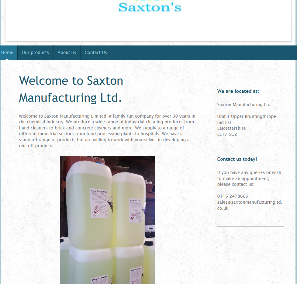 Welcome to Saxton Manufacturing Limited, a family run company for over 30 years in the chemical industry. We produce a wide range of industrial cleaning products from hand cleaners to brick and concrete cleaners and more. We supply to a range of different industrial sectors from food processing plants to hospitals. We have a standard range of products but are willing to work with yourselves in developing a one off products.