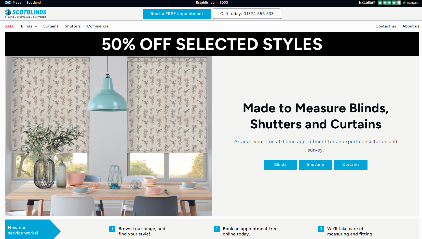 Scotblinds have over 20 years of expertise in the Falkirk area where we have earned an excellent reputation among our satisfied customers. We manufacture almost all the products we supply ourselves giving us maximum control over quality. We can offer all styles and fabrics from the biggest names in our industry including Dutton and Gavin, Arena, Louvolite, Eclipse, Decora, Somfy, Custom West Shutters, Hunter Douglas, Silent Gliss, Harlequin, Prestigious Textiles, Voyage fabrics and many more.